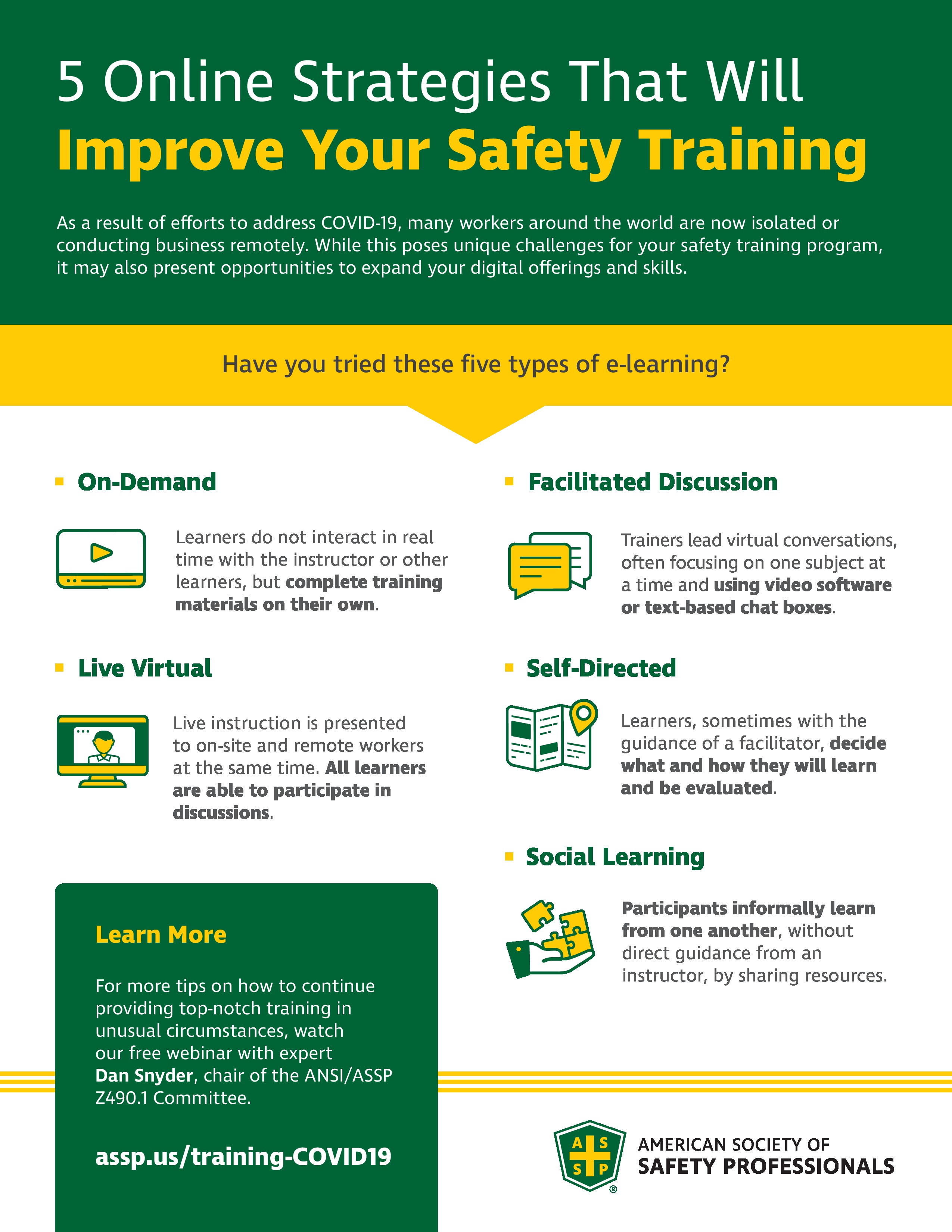 For more tips on how to continue providing top-notch training in unusual circumstances, watch our free webinar with expert Dan Snyder, chair of the ANSI/ASSP Z490.1 Committee.