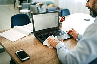 • Safety-professional-wearing-headphones-watching-webinar-taking-notes